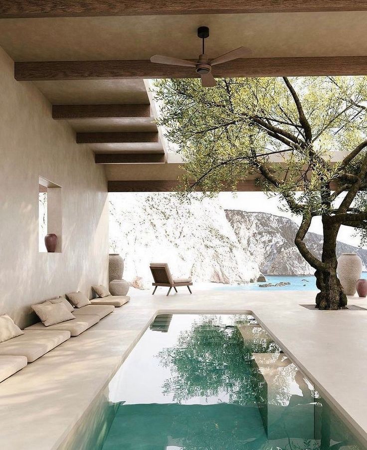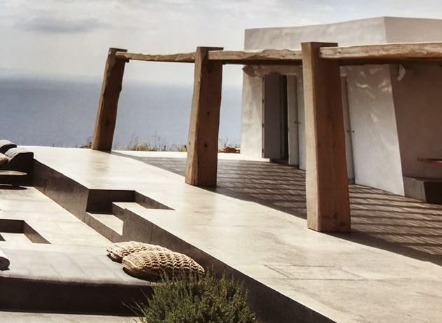 The material palette draws from the island’s geology—warm local stone, soft plaster tones, and concrete shades within the Pantone 424–428 spectrum—achieving harmony with the surrounding terrain while emphasizing tactile authenticity. Minimal detailing and measured geometry convey a timeless balance between restraint and comfort.