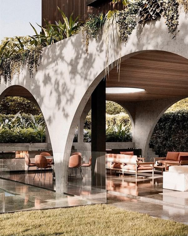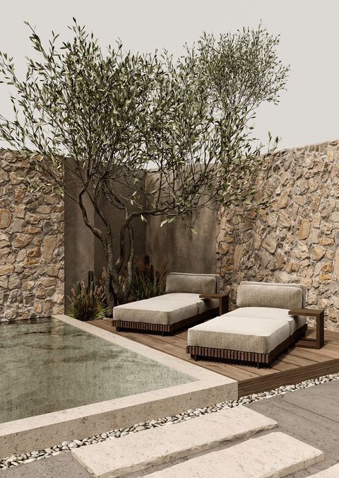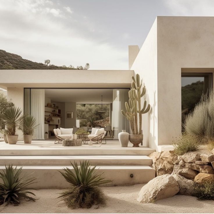 Highlights: Local stone, Pantone 424–428 concrete tones, seamless indoor-outdoor flow