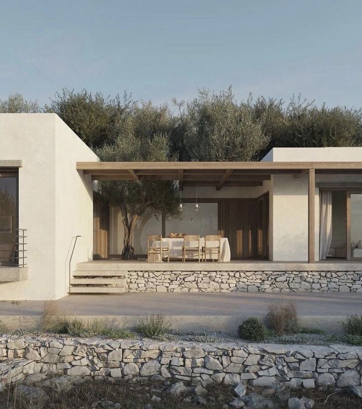 Organized in simple intersecting volumes of stone and exposed concrete, the house opens toward the sea through large glazed surfaces that extend interior life to shaded verandas and terraces. Courtyards and semi-outdoor spaces articulate the boundary between built form and landscape, offering a continuous play of light, shadow, and sea breeze.