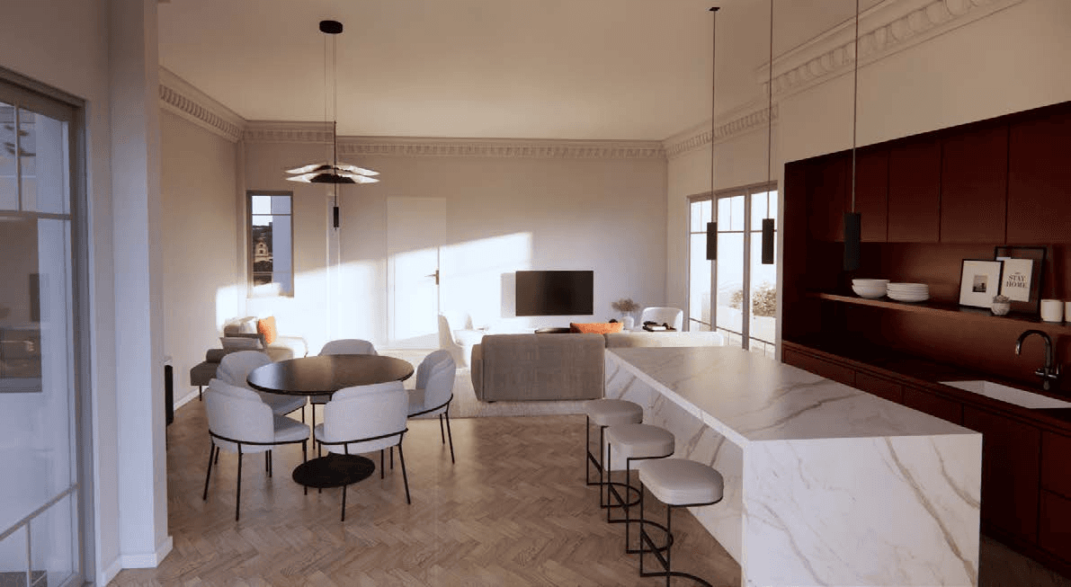 Each apartment unfolds as a composition of contrasts minimal yet warm, urban yet serene. Living and dining areas are designed as the social core of the home, where everyday life and hospitality meet. The kitchens extend this openness, blending function and atmosphere into a single continuous space.